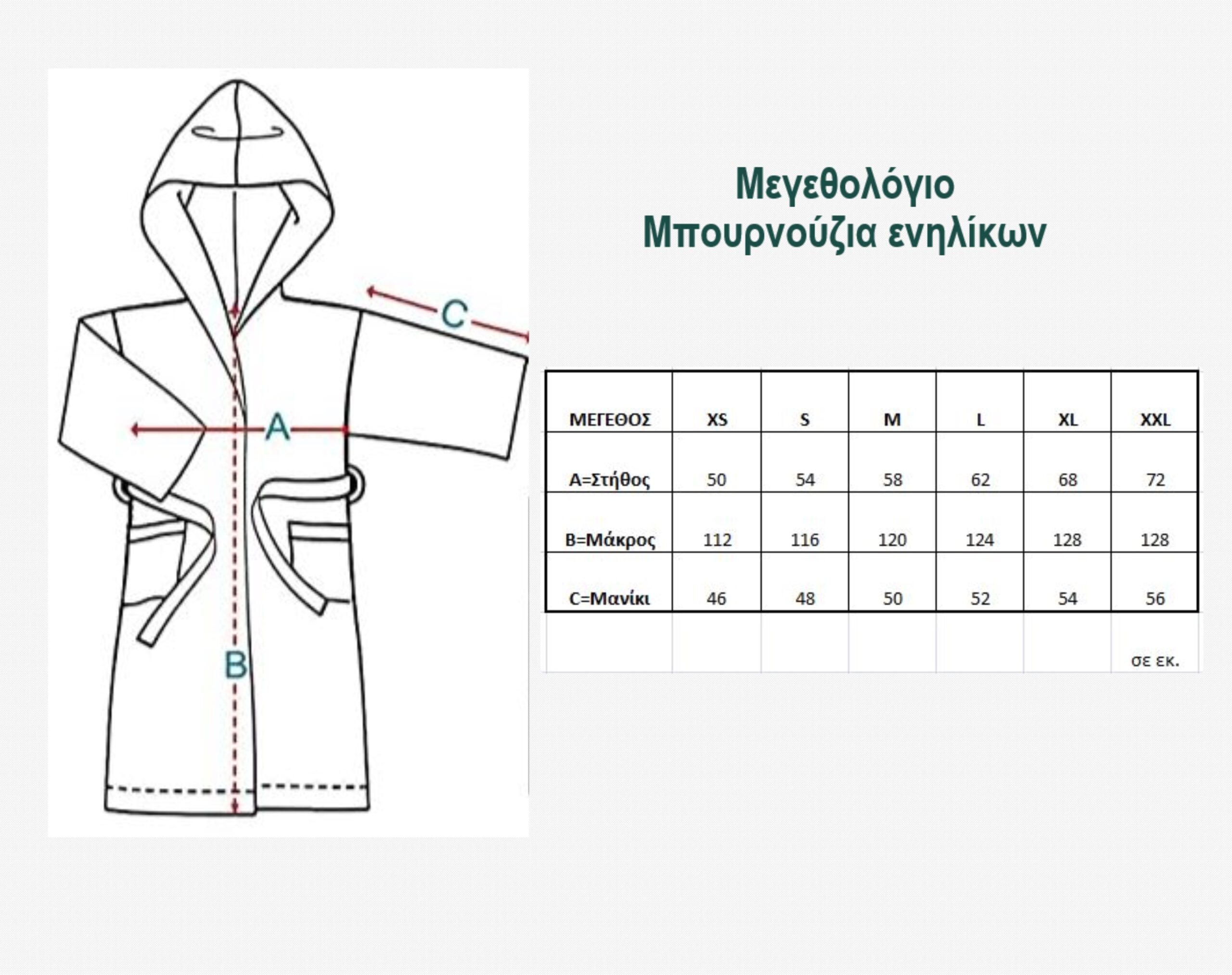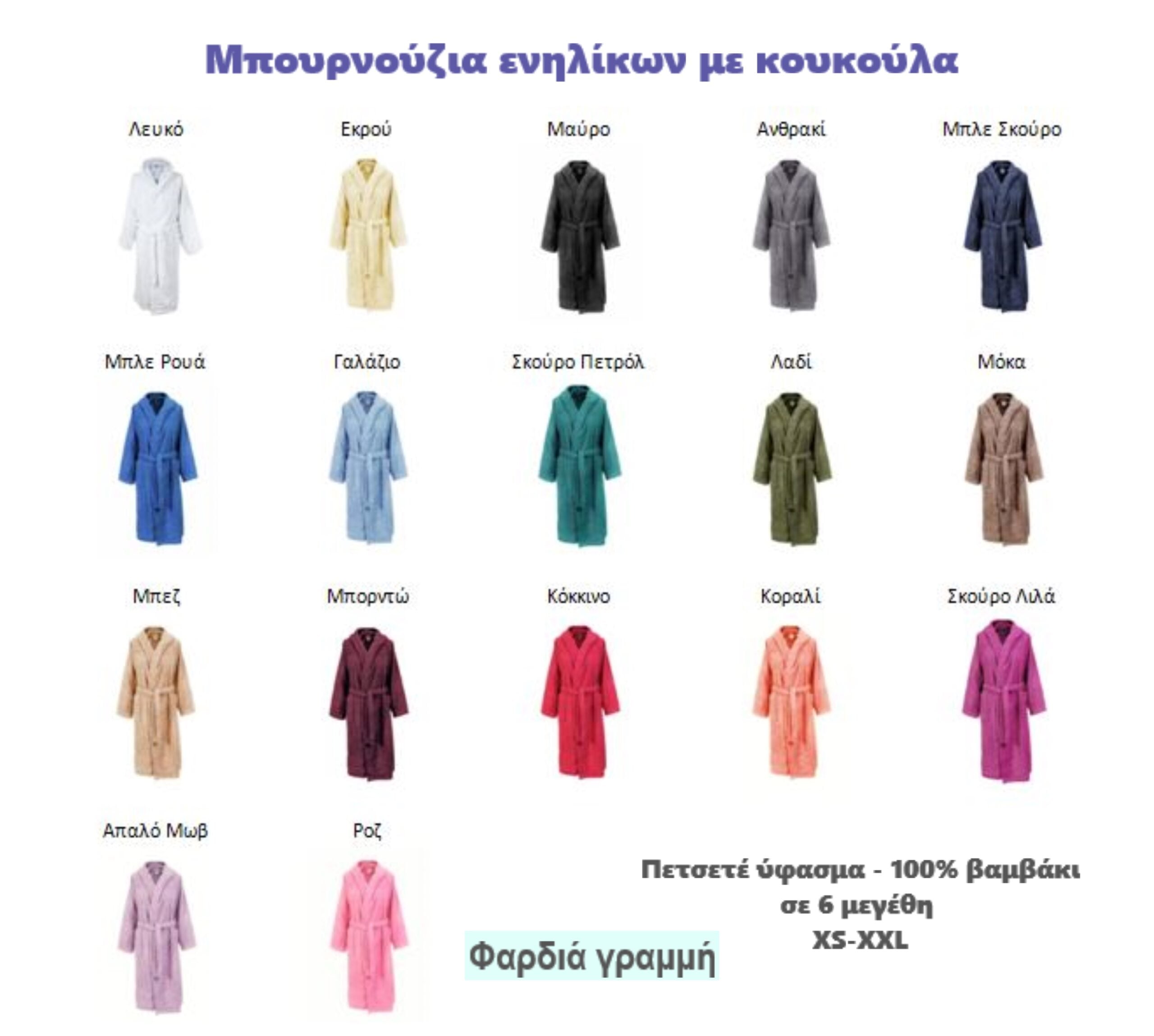 | Ανδρικό μπουρνούζι | Λευκό S, Λευκό M, Λευκό L, Εκρού XS, Εκρού S, Εκρού M, Εκρού L, Εκρού XL, Εκρού XXL, Μαύρο S, Μαύρο M, Μαύρο L, Μαύρο XL, Μαύρο XXL, Ανθρακί XS, Μπλε σκούρο XL, Μπλε Ρουά S, Μπλε Ρουά M, Μπλε Ρουά L, Μπλε Ρουά XL, Μπλε Ρουά XXL, Γαλάζιο S, Σκούρο Πετρόλ XS, Σκούρο Πετρόλ S, Σκούρο Πετρόλ M, Σκούρο Πετρόλ L, Σκούρο Πετρόλ XL, Λαδί S, Λαδί M, Λαδί L, Λαδί XL, Λαδί XXL, Μόκα S, Μπεζ XS, Μπεζ S, Μπεζ M, Μπεζ L, Μπεζ XL, Μπεζ XXL, Μπορντώ XS, Κόκκινο XS, Κόκκινο S, Κόκκινο M, Κόκκινο L, Κόκκινο XL, Κοραλί XS, Κοραλί L, Απαλό Μωβ L, Ροζ XS, Ροζ S, Ροζ M, Ροζ L |