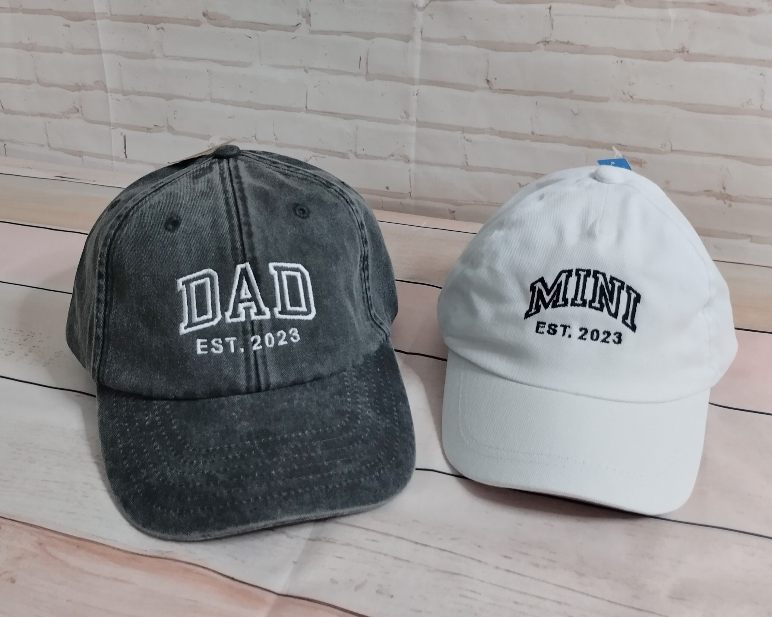 Επίλεξε το χρώμα του καπέλου για τον γονιό και το χρώμα και το μέγεθος του καπέλου για το παιδί πάνω στα οποία θέλεις να κεντηθούν τα κείμενα ή τα σχέδια, καθώς και την κλωστή για το καθένα.