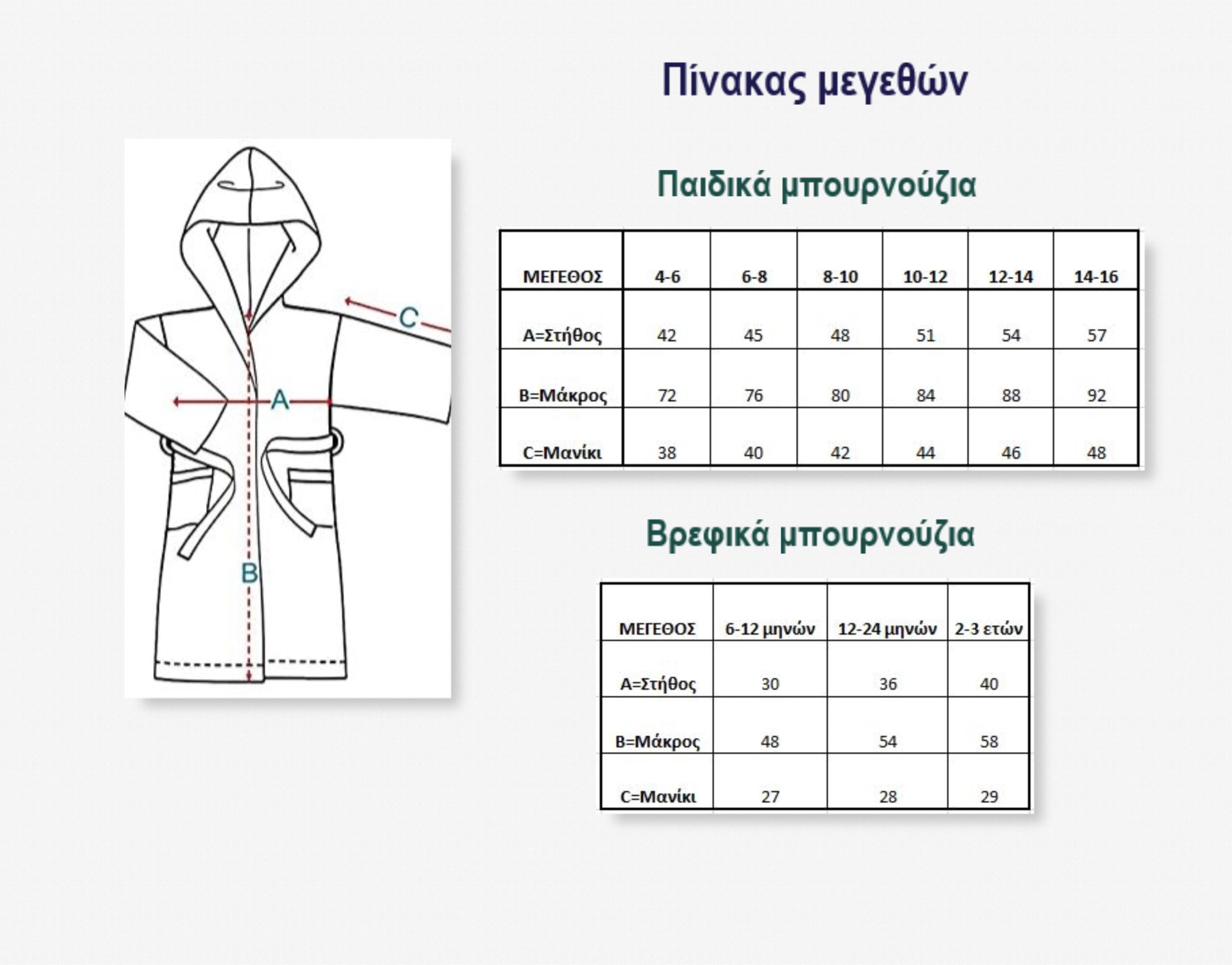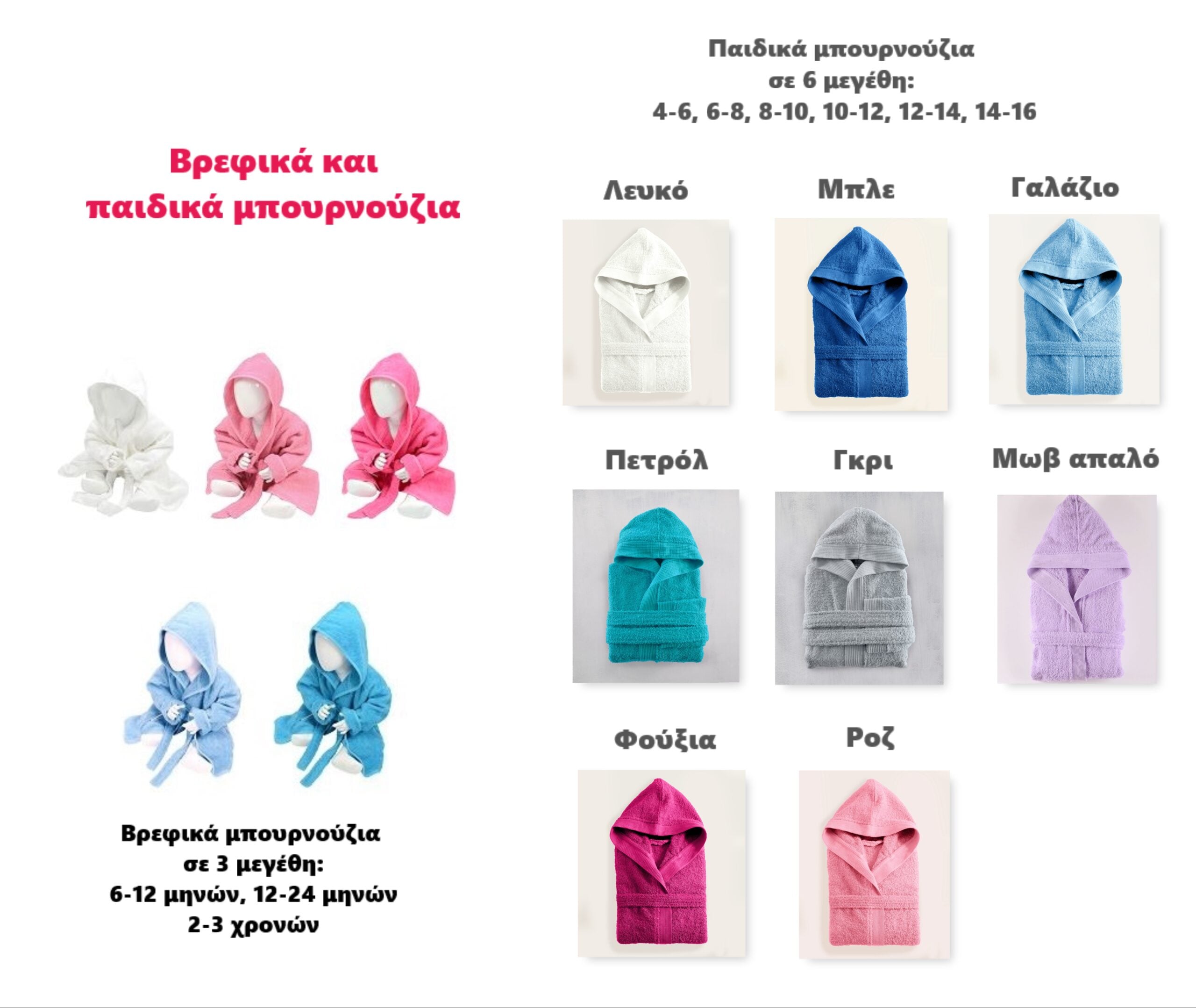 | Χρώμα και μέγεθος μπουρνουζιού | Βρεφικό – Λευκό 0-12 μηνών (ύψος 68-74 εκ), Βρεφικό – Λευκό 1-2 ετών (ύψος 80-92 εκ), Βρεφικό – Λευκό 2-3 ετών (ύψος 98-110 εκ), Βρεφικό – Ροζ απαλό 0-12 μηνών (ύψος 68-74 εκ), Βρεφικό – Ροζ απαλό 1-2 ετών (ύψος 80-92 εκ), Βρεφικό – Φούξια 0-12 μηνών (ύψος 68-74 εκ), Βρεφικό – Φούξια 1-2 ετών (ύψος 80-92 εκ), Βρεφικό – Φούξια 2-3 ετών (ύψος 98-110 εκ), Βρεφικό – Γαλάζιο απαλό 0-12 μηνών (ύψος 68-74 εκ), Βρεφικό – Γαλάζιο απαλό 1-2 ετών (ύψος 80-92 εκ), Βρεφικό – Γαλάζιο απαλό 2-3 ετών (ύψος 98-110 εκ), Βρεφικό – Τυρκουάζ 0-12 μηνών (ύψος 68-74 εκ), Βρεφικό – Τυρκουάζ 1- 2 ετών (ύψος 80-92 εκ), Βρεφικό – Τυρκουάζ 2-3 ετών (ύψος 98-110 εκ), Παιδικό – Λευκό – 4-6 ετών, Παιδικό – Λευκό – 6-8 ετών, Παιδικό – Λευκό – 8-10 ετών, Παιδικό – Λευκό – 12-14 ετών, Παιδικό – Λευκό – 14-16 ετών, Παιδικό – Μπλε – 6-8 ετών, Παιδικό – Μπλε – 8-10 ετών, Παιδικό – Μπλε – 10-12 ετών, Παιδικό – Μπλε – 12-14 ετών, Παιδικό – Μπλε – 14-16 ετών, Παιδικό – Γαλάζιο – 4-6 ετών, Παιδικό – Γαλάζιο – 6-8 ετών, Παιδικό – Γαλάζιο – 8-10 ετών, Παιδικό – Γαλάζιο – 10-12 ετών, Παιδικό – Γαλάζιο – 12-14 ετών, Παιδικό – Γαλάζιο – 14-16 ετών, Παιδικό – Πετρόλ – 6-8 ετών, Παιδικό – Πετρόλ – 8-10 ετών, Παιδικό – Πετρόλ – 10-12 ετών, Παιδικό – Πετρόλ – 12-14 ετών, Παιδικό – Πετρόλ – 14-16 ετών, Παιδικό – Γκρι – 4-6 ετών, Παιδικό – Γκρι – 6-8 ετών, Παιδικό – Γκρι – 8-10 ετών, Παιδικό – Γκρι – 10-12 ετών, Παιδικό – Γκρι – 12-14 ετών, Παιδικό – Γκρι – 14-16 ετών, Παιδικό – Μωβ απαλό – 6-8 ετών, Παιδικό – Μωβ απαλό – 14-16 ετών, Παιδικό – Φούξια – 8-10 ετών, Παιδικό – Φούξια – 10-12 ετών, Παιδικό – Φούξια – 12-14 ετών, Παιδικό – Φούξια – 14-16 ετών, Παιδικό – Ροζ – 8-10 ετών, Παιδικό – Ροζ – 10-12 ετών, Παιδικό – Ροζ – 12-14 ετών, Παιδικό – Ροζ – 14-16 ετών |