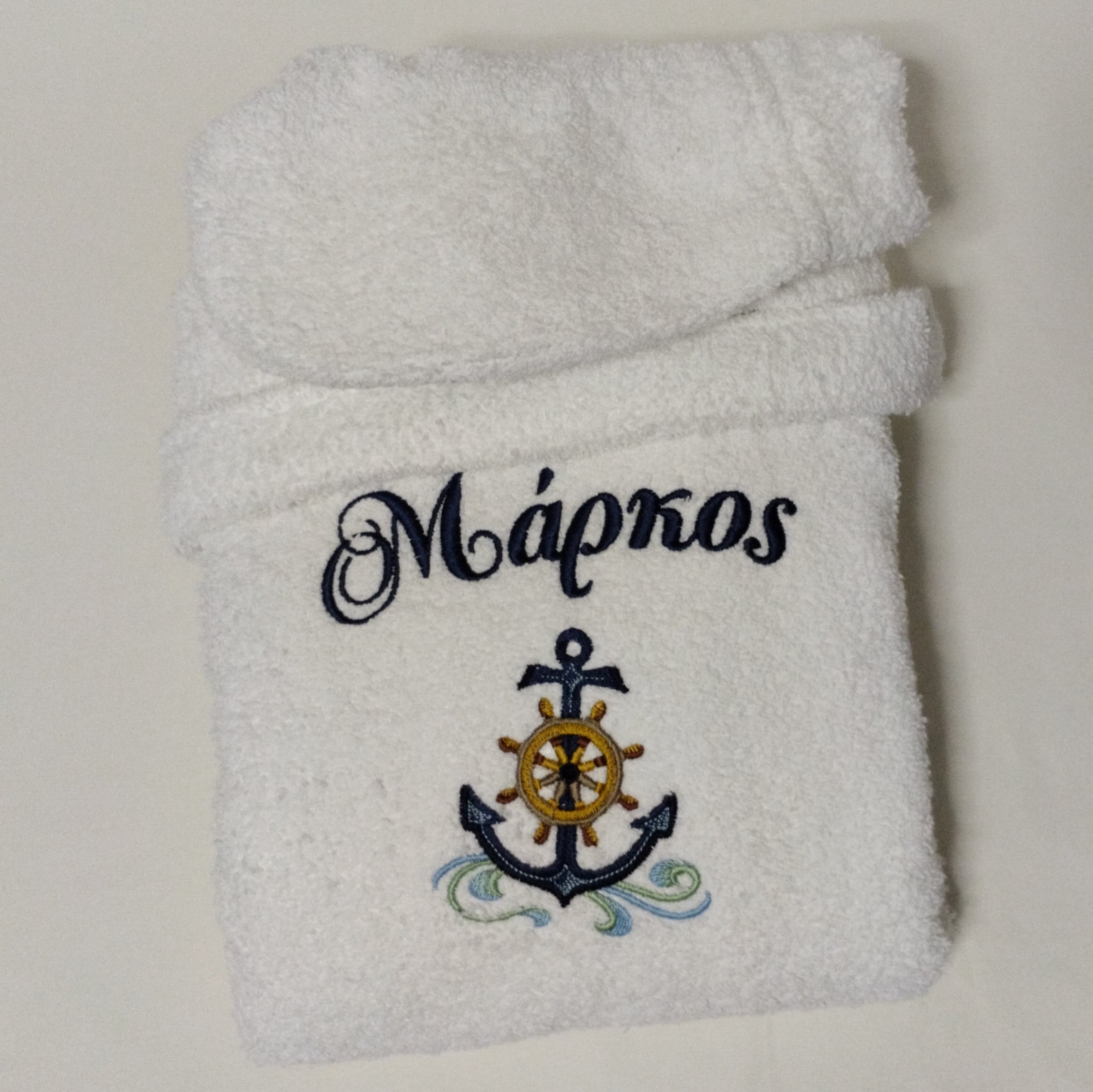Παιδικό μπουρνούζι με κέντημα – Άγκυρα – ναυτικό τιμόνι και όνομα