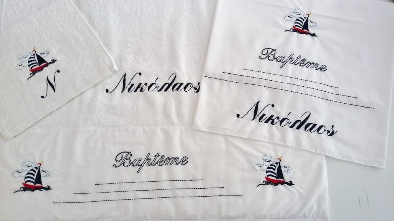 Σετ λαδόπανα με κέντημα – Θέμα βάπτισης-Καραβάκι